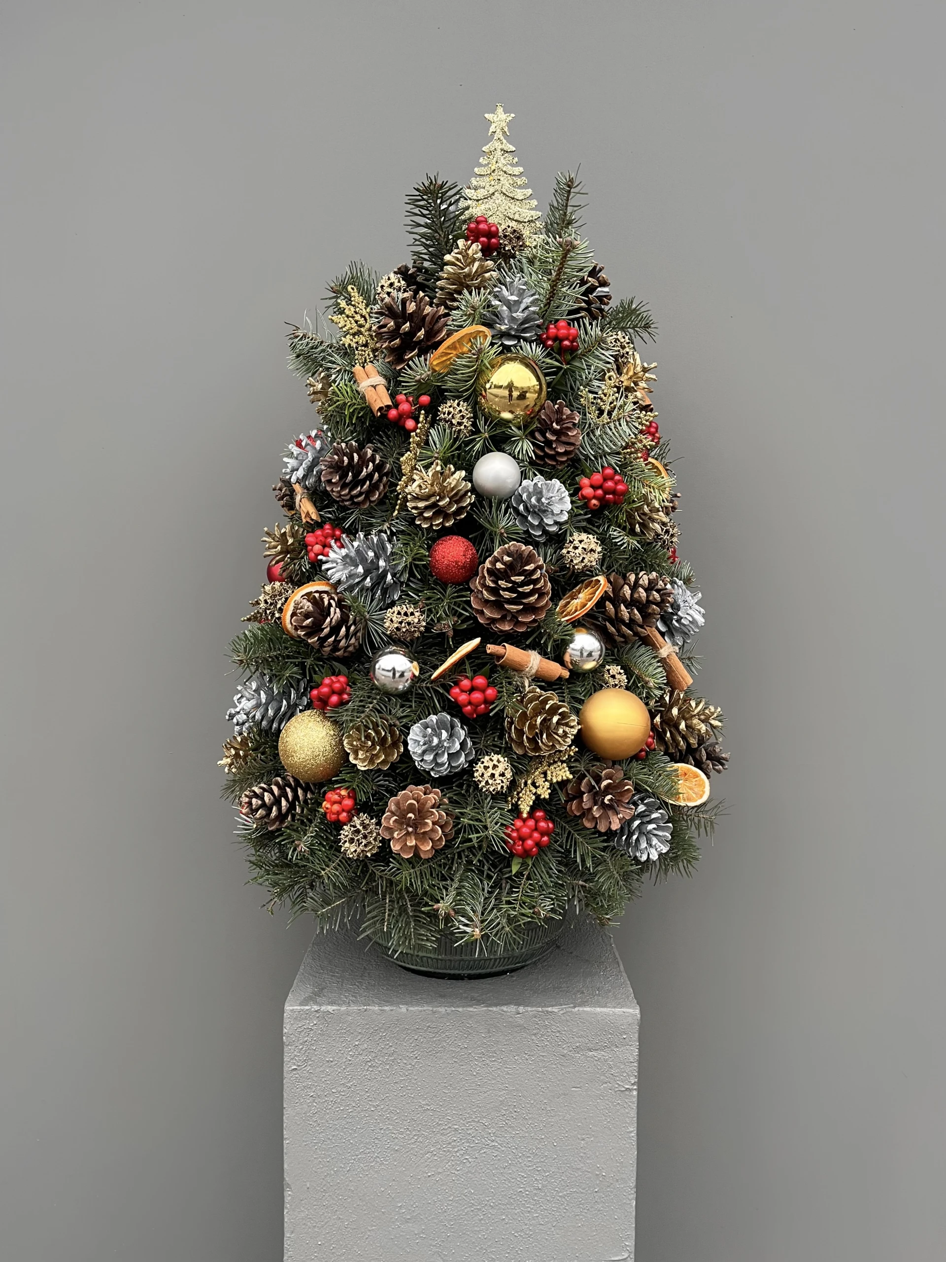 Gümüş, altın ve naturel kozalaklar, kokina, dekoratif tarçın, dekoratif portakal dilimleri, top süsler, quercus yaprakları