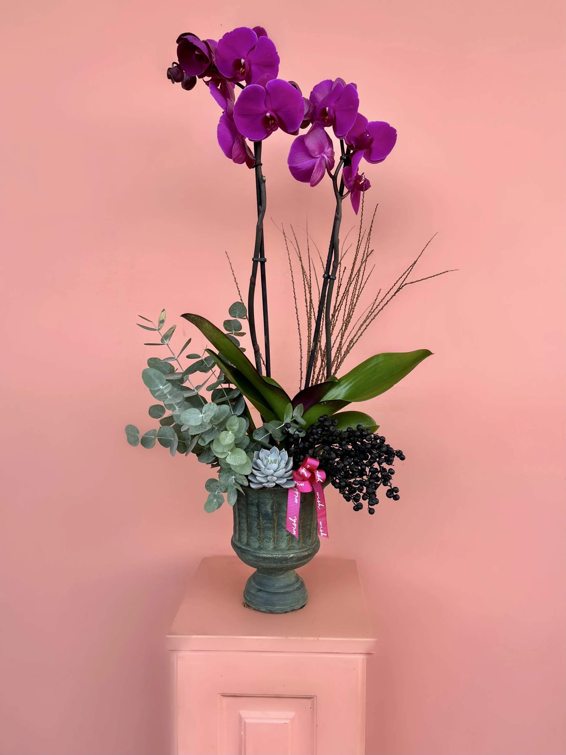 Fuşya Orkide; yaldızlı, antik görünümlü ayaklı saksı içerisine 2 dallı fuşya orkide, okaliptus, siyah üzüm, sukulent  ve kuru dallar ile ekibimiz tarafından sizin için tasarlanmıştır.