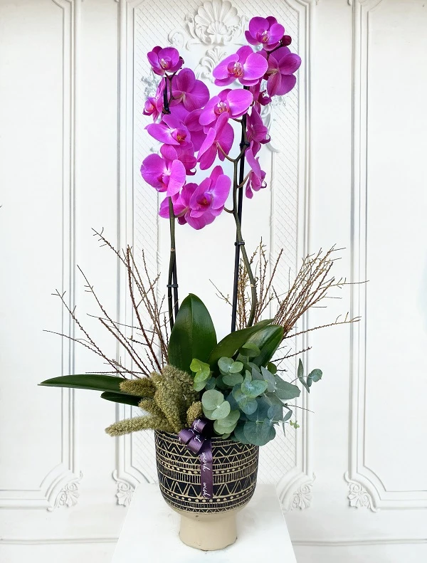 Fuşya Orkide; etnik desenli seramik vazo içerisine 2 dallı fuşya orkide, kurutulmuş seterya, okaliptus ve kuru dallar ile sizin için ekibimiz tarafından tasarlanmııştır.