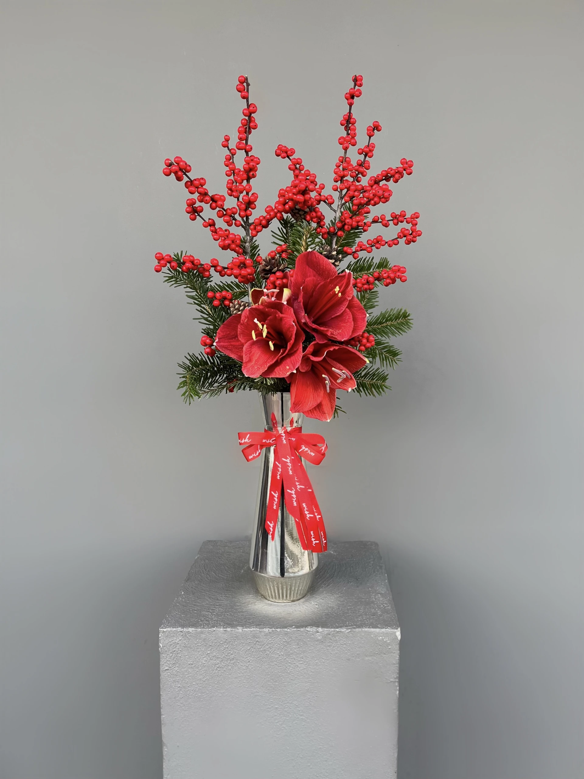 Gümüş cam vazo içerisinde Ilex, Amaryllis, Çam ve kozalar ile yılbaşına özel tasarlanmıştır.