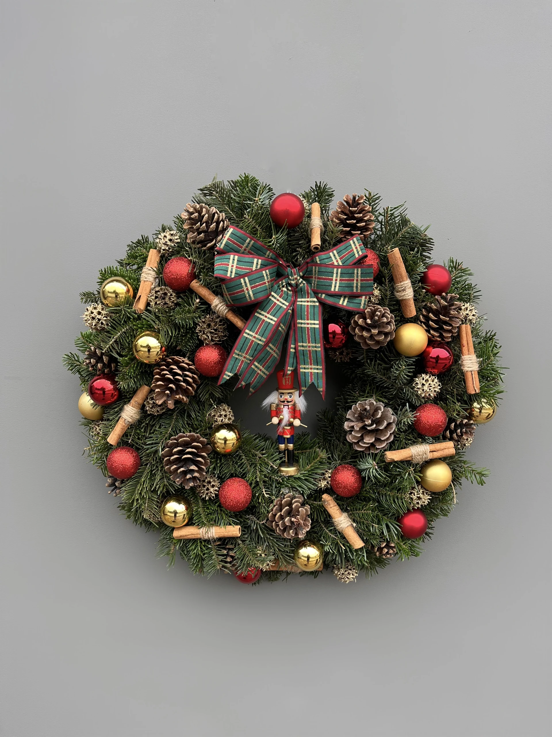 Canlı çam ile hazırladığımız özel NutCracker ahşap figür, süs altın-kırmızı toplar, naturel kozalaklar, dekoratif tarçın ve ekoseli kurdele ile süslediğmiz el yapımı yılbaşı temalı kapı süsümüz yeni yıl için en özel hediye seçeneklerinden