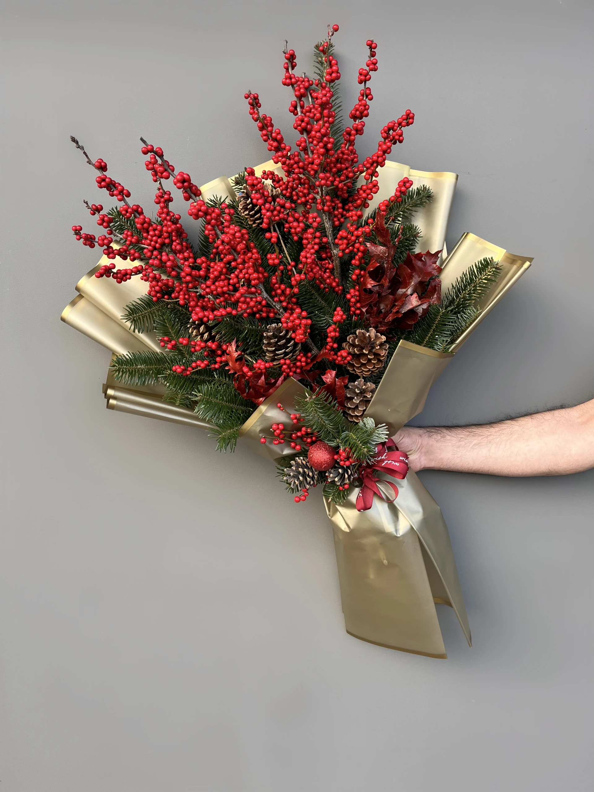 3 dal ithal Ilex , canlı çam dalları, kozalak ve querkus yapraklarından oluşan yılbaşına özel Ilex buketi.